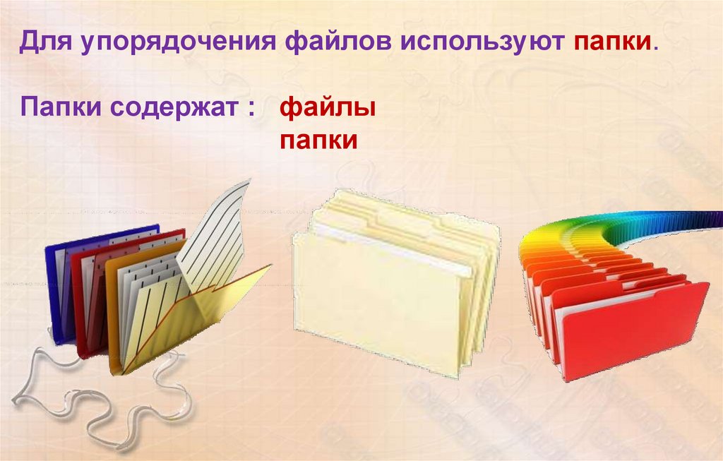 Для упорядочения файлов используют папки.Папки содержат : файлы