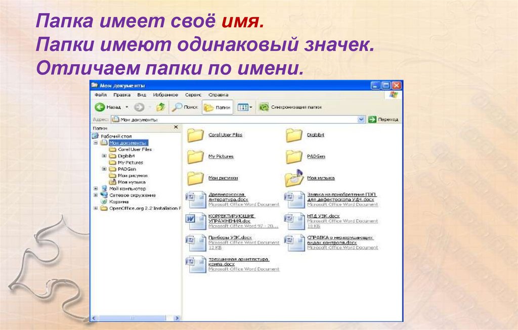 Папка имеет своё имя.Папки имеют одинаковый значек.