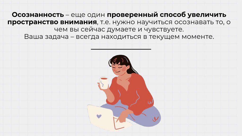 Осознанность – еще один проверенный способ увеличитьпространство внимания, т.е. нужно научиться осознавать то, о
