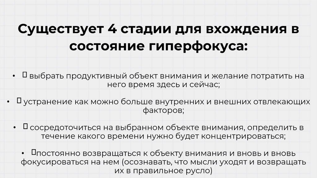 Существует 4 стадии для вхождения всостояние гиперфокуса: