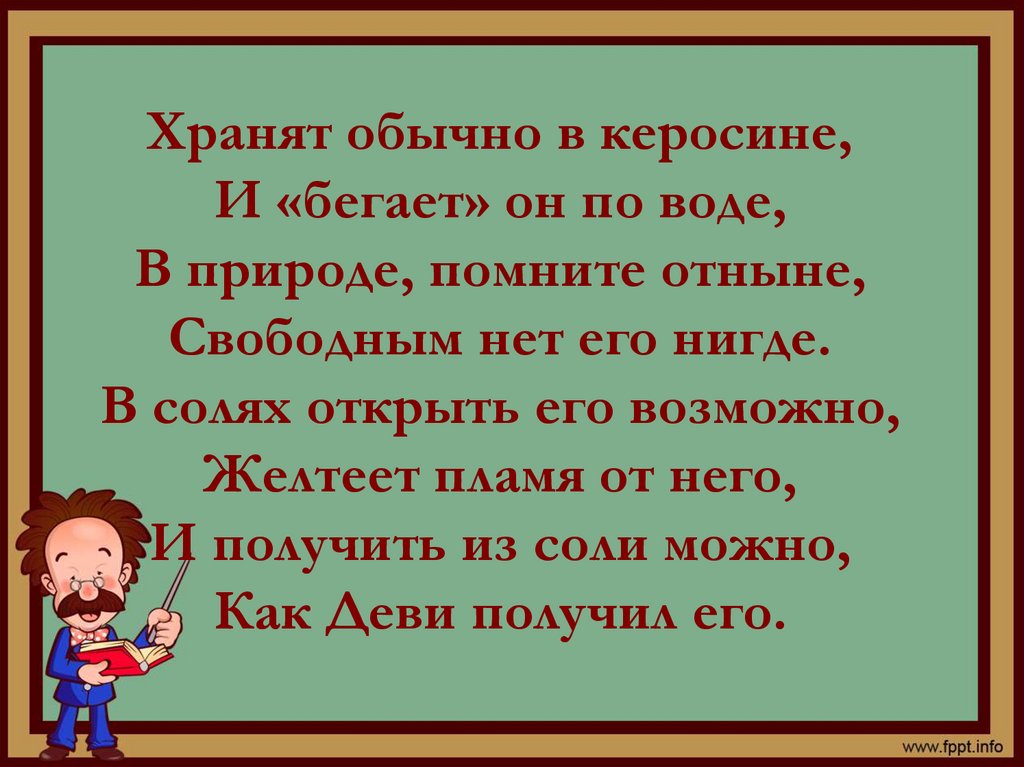 Хранят обычно в керосине,И «бегает» он по воде,