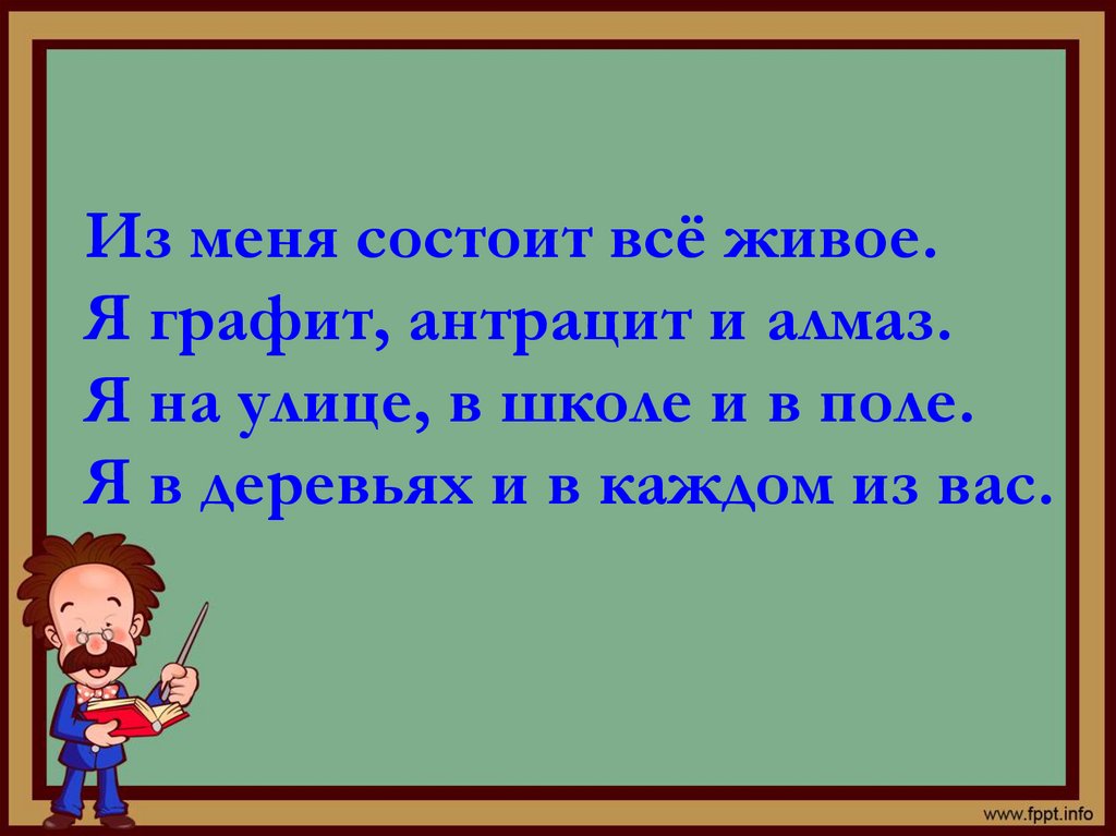 Из меня состоит всё живое.Я графит, антрацит и алмаз.