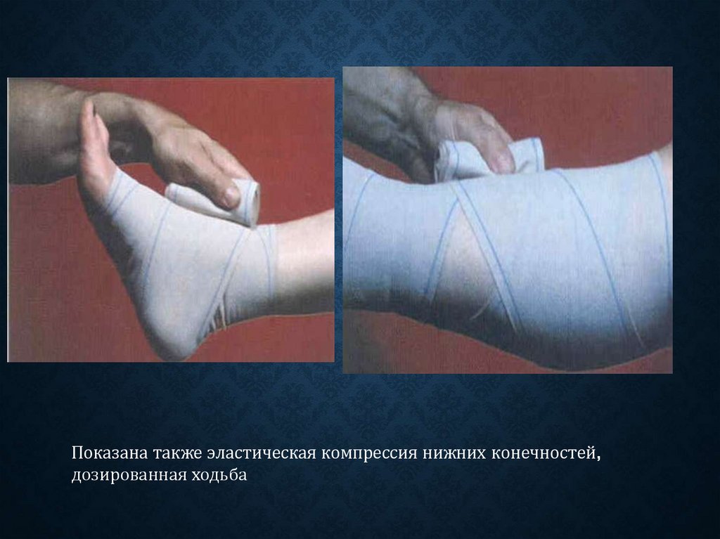 Показана также эластическая компрессия нижних конечностей,дозированная ходьба