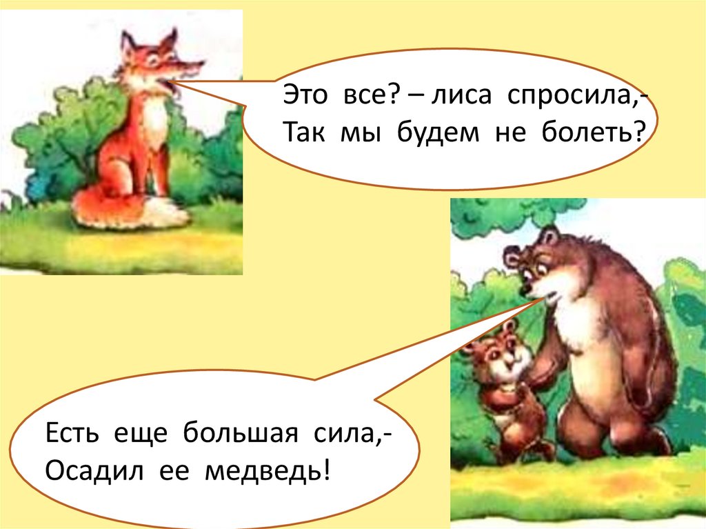Это все? – лиса спросила,Так мы будем не болеть?Есть еще большая сила,Осадил ее медведь!