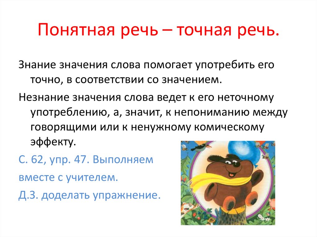 Понятная речь – точная речь.Знание значения слова помогает употребить его
