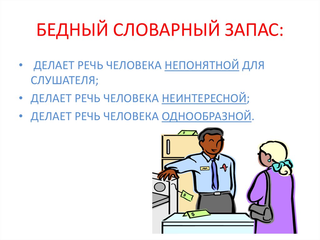 БЕДНЫЙ СЛОВАРНЫЙ ЗАПАС:• ДЕЛАЕТ РЕЧЬ ЧЕЛОВЕКА НЕПОНЯТНОЙ ДЛЯ