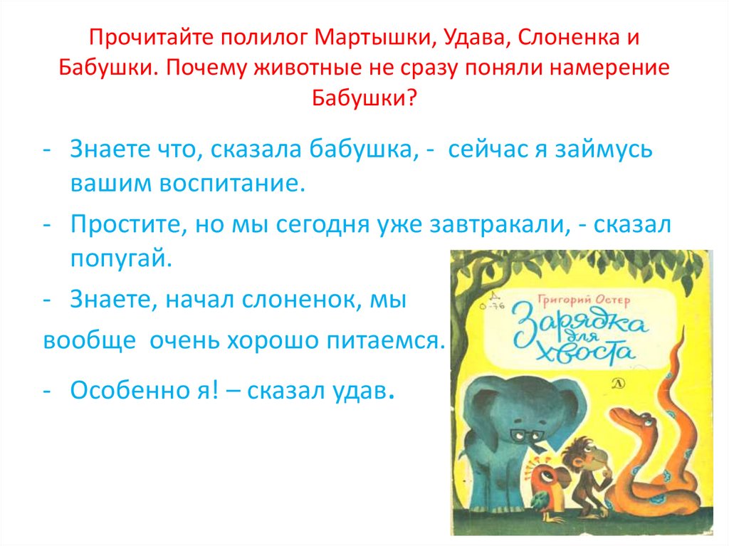 Прочитайте полилог Мартышки, Удава, Слоненка иБабушки. Почему животные не сразу поняли намерение