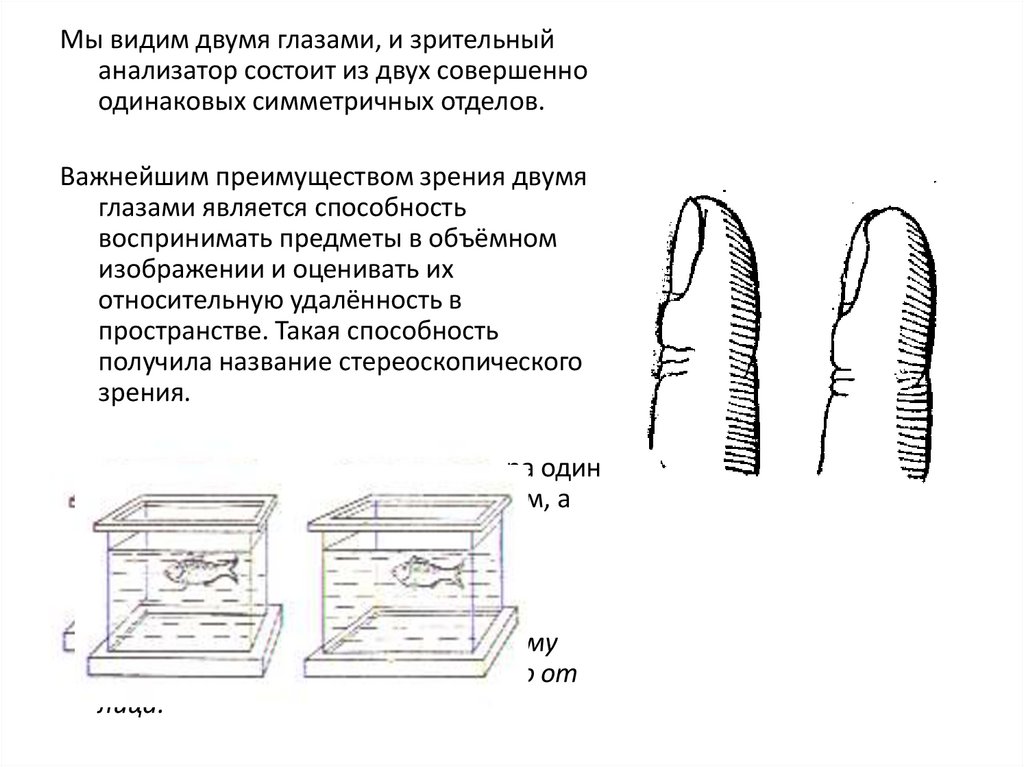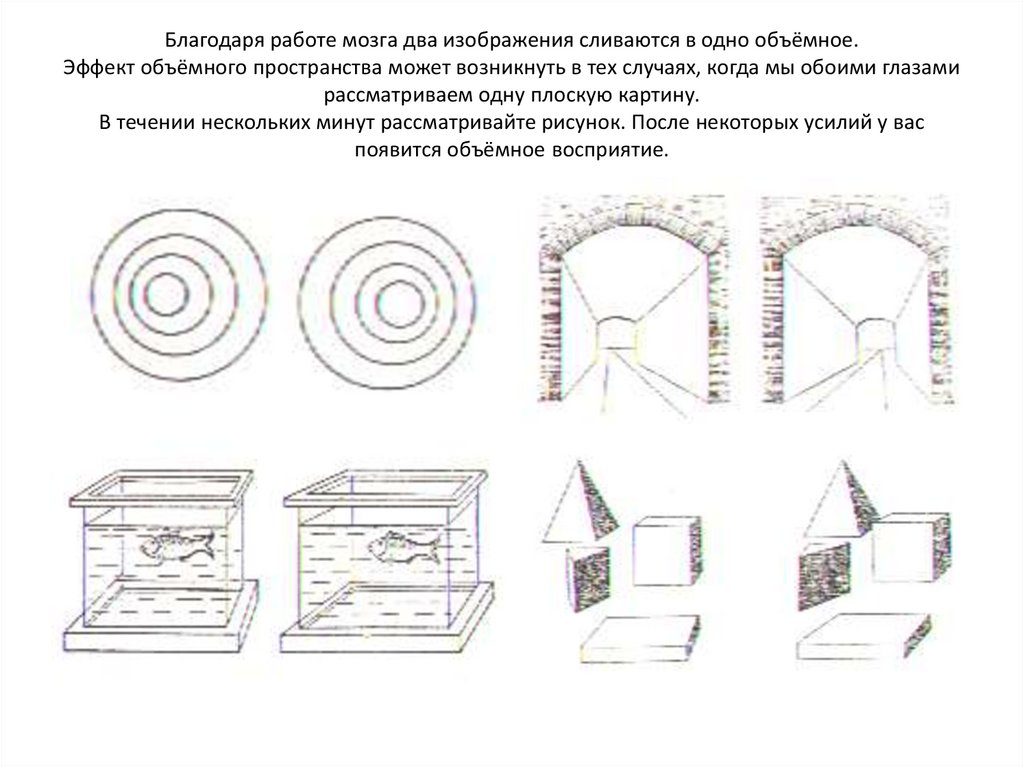 Благодаря работе мозга два изображения сливаются в одно объёмное.Эффект объёмного пространства может возникнуть в тех случаях, когда мы обоими глазами