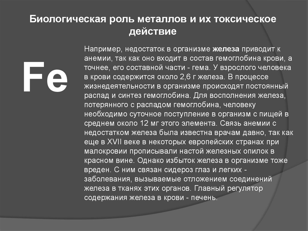 вреден. С ним связан сидероз глаз и легких заболевания, вызываемые отложением соединений