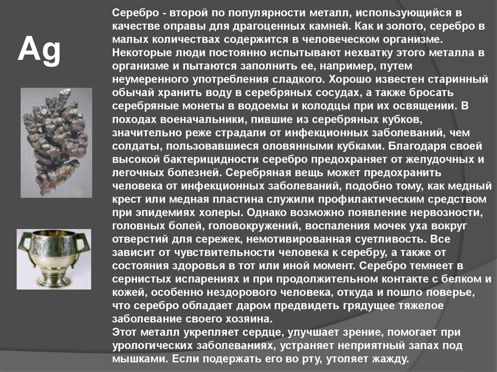 качестве оправы для драгоценных камней. Как и золото, серебро в