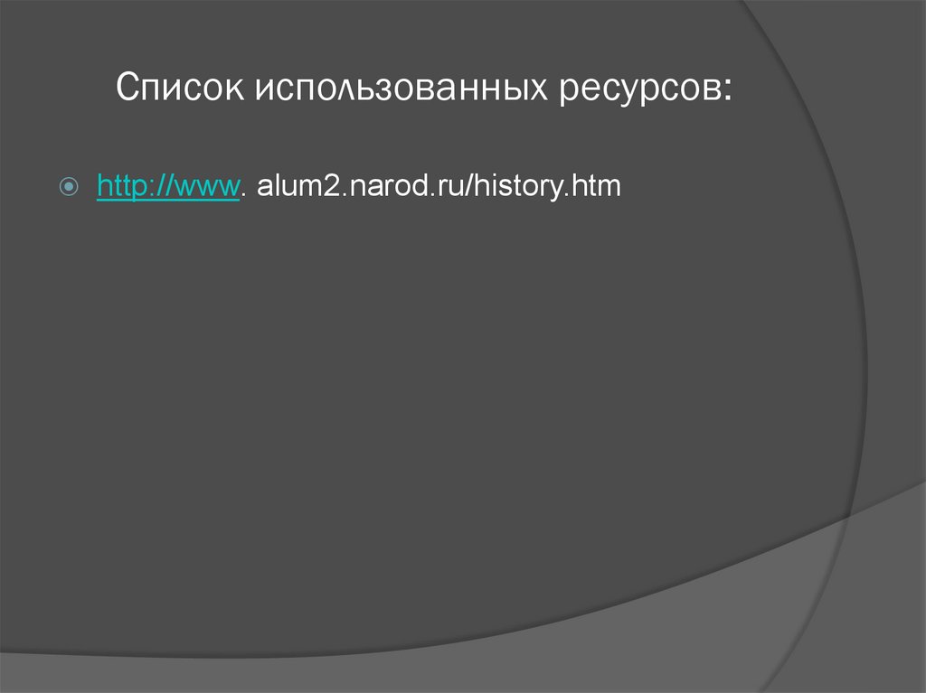 Список использованных ресурсов:http://www. alum2.narod.ru/history.htm