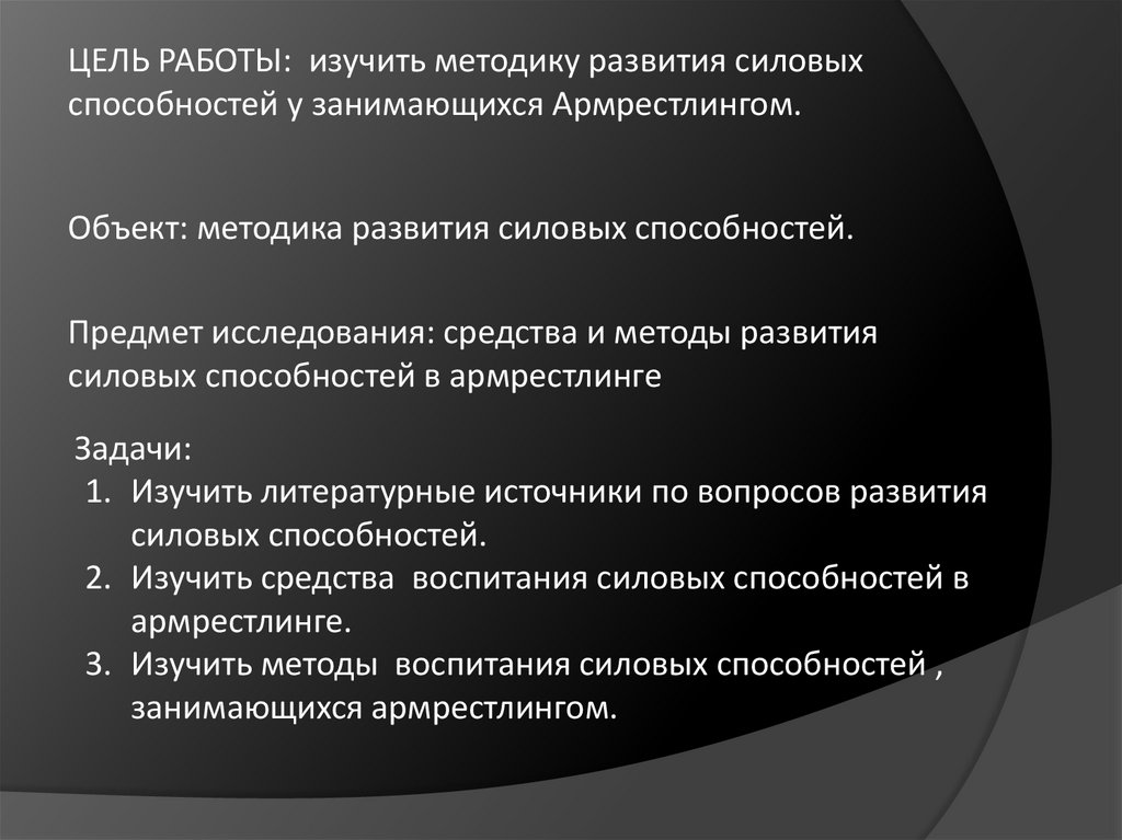 ЦЕЛЬ РАБОТЫ: изучить методику развития силовыхспособностей у занимающихся Армрестлингом.