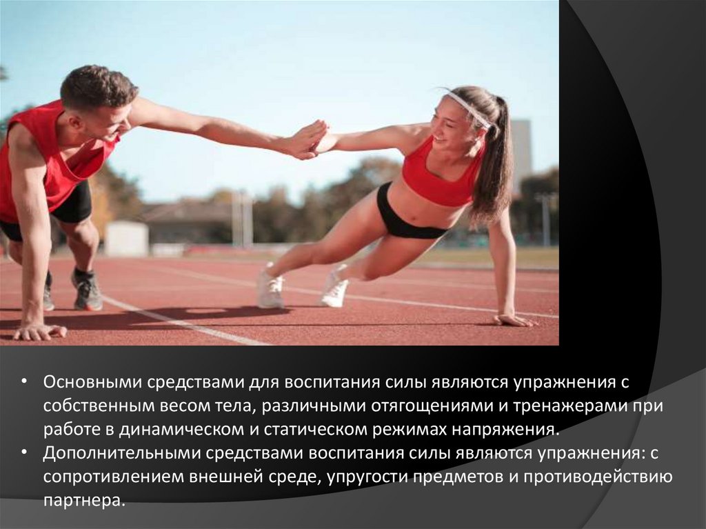 • Основными средствами для воспитания силы являются упражнения ссобственным весом тела, различными отягощениями и тренажерами при