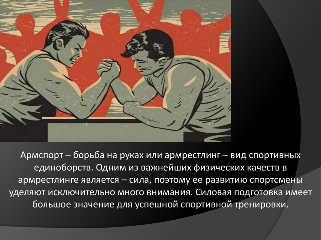 Армспорт – борьба на руках или армрестлинг – вид спортивныхединоборств. Одним из важнейших физических качеств в