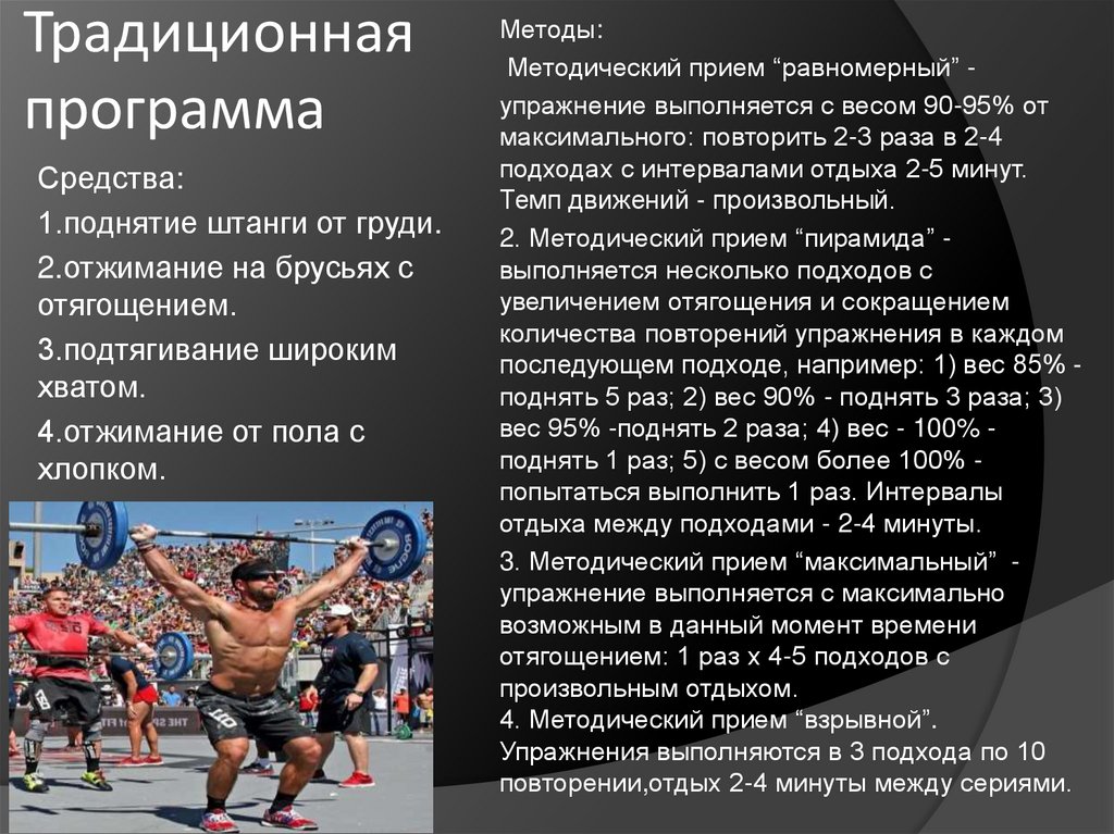 вес 95% -поднять 2 раза; 4) вес - 100% поднять 1 раз; 5) с весом более 100% попытаться выполнить 1 раз. Интервалы