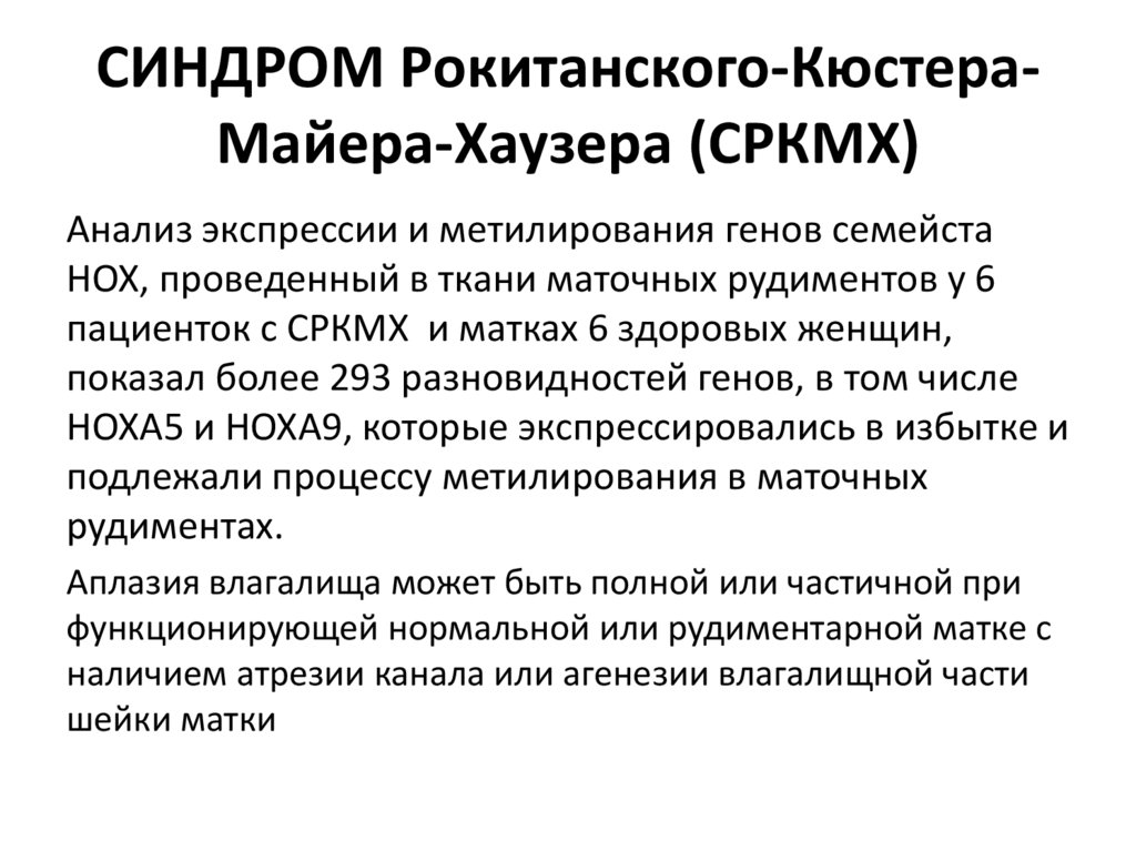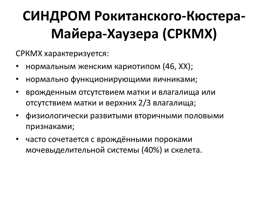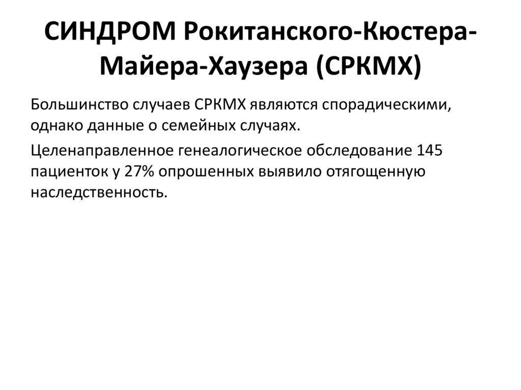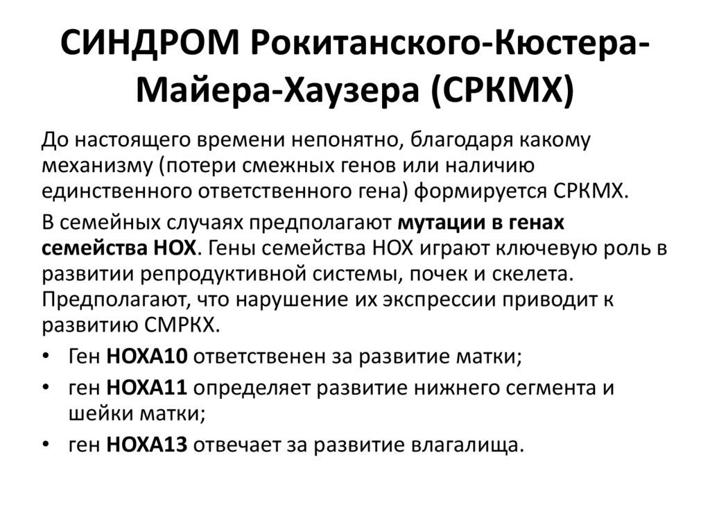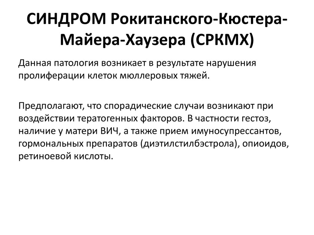 СИНДРОМ Рокитанского-КюстераМайера-Хаузера (СРКМХ)До настоящего времени непонятно, благодаря какому