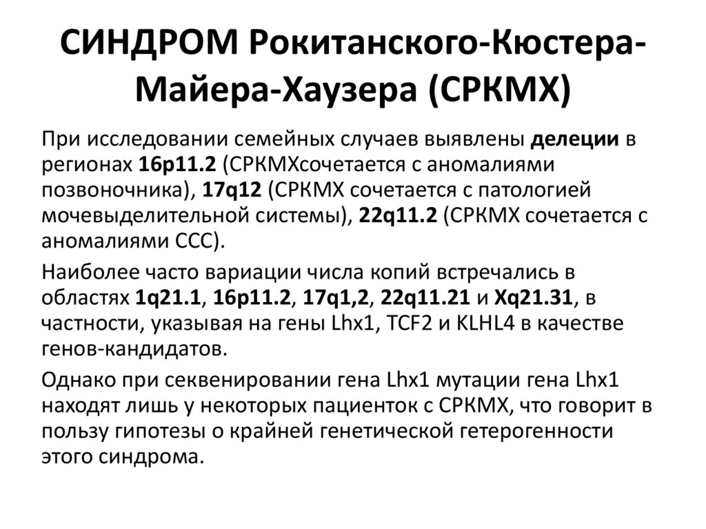 СИНДРОМ Рокитанского-КюстераМайера-Хаузера (СРКМХ)При исследовании семейных случаев выявлены делеции в