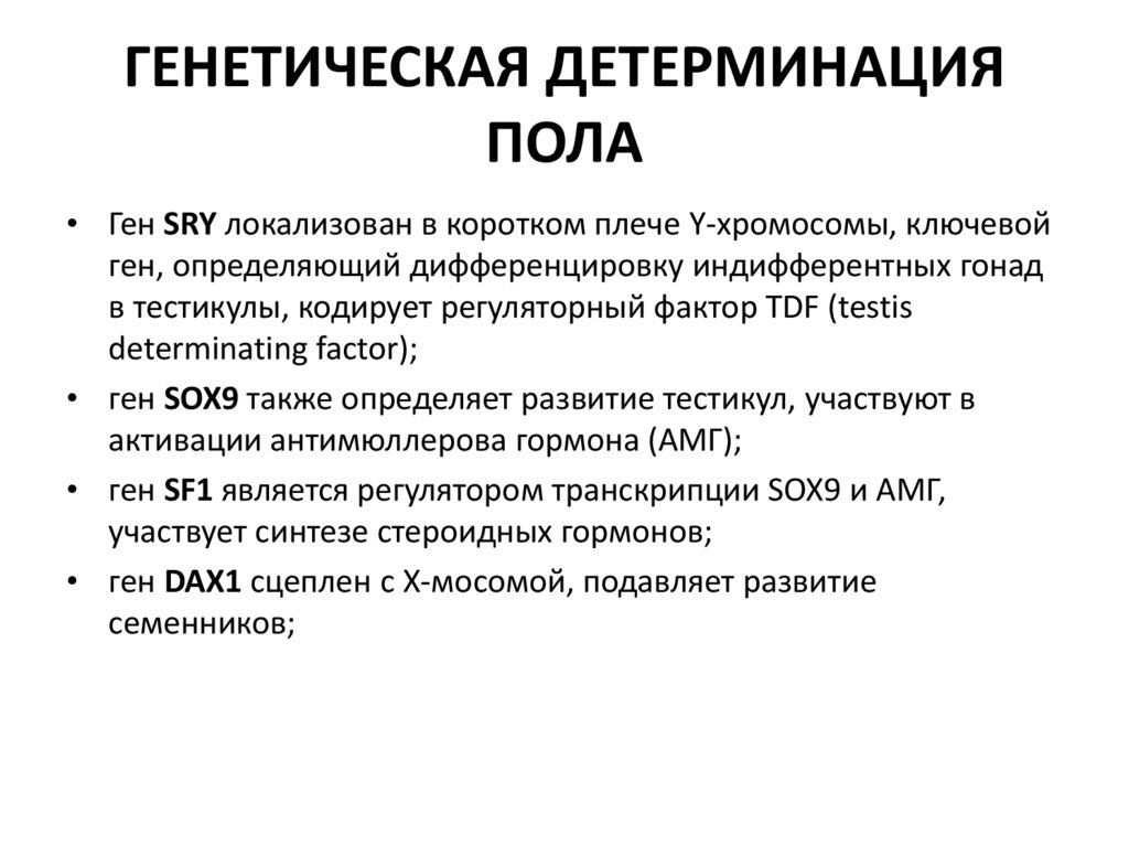 • Ген SRY локализован в коротком плече Y-хромосомы, ключевой