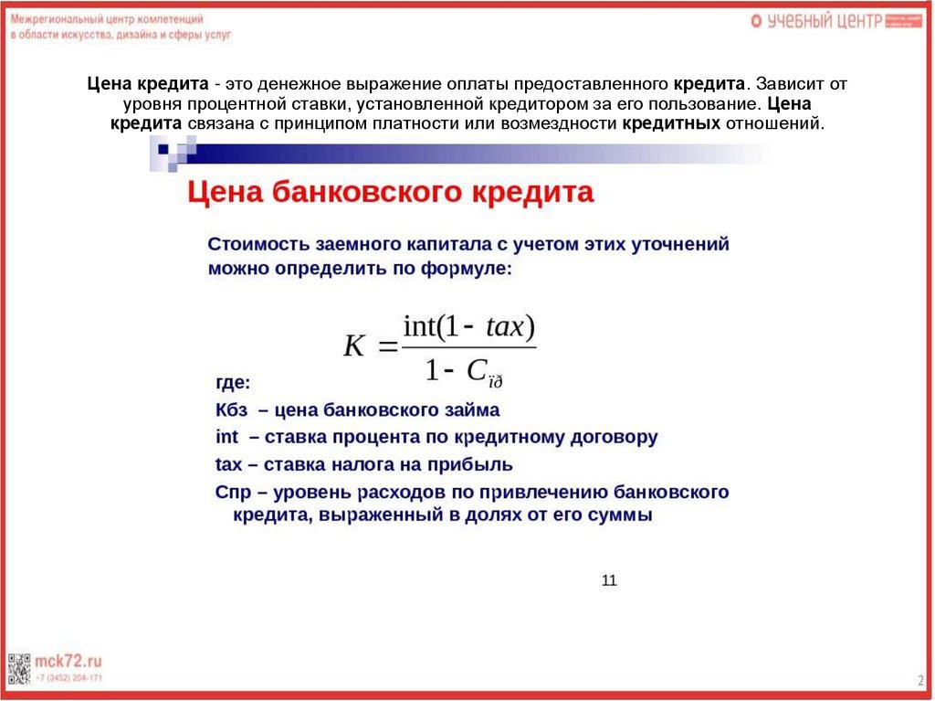 Цена кредита - это денежное выражение оплаты предоставленного кредита. Зависит отуровня процентной ставки, установленной кредитором за его пользование. Цена