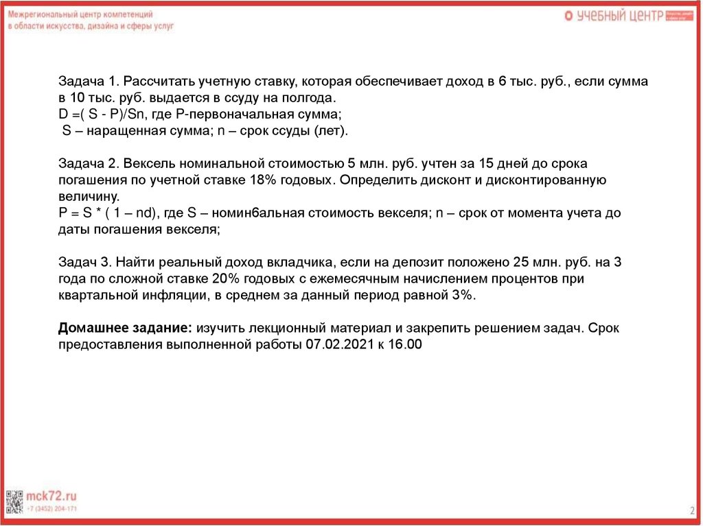 Задача 1. Рассчитать учетную ставку, которая обеспечивает доход в 6 тыс. руб., если суммав 10 тыс. руб. выдается в ссуду на полгода.