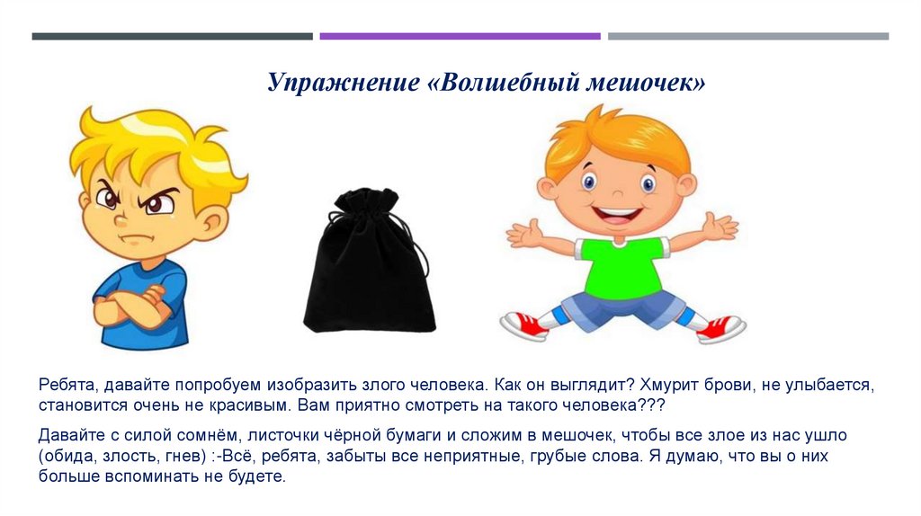 Упражнение «Волшебный мешочек»Ребята, давайте попробуем изобразить злого человека. Как он выглядит? Хмурит брови, не улыбается,