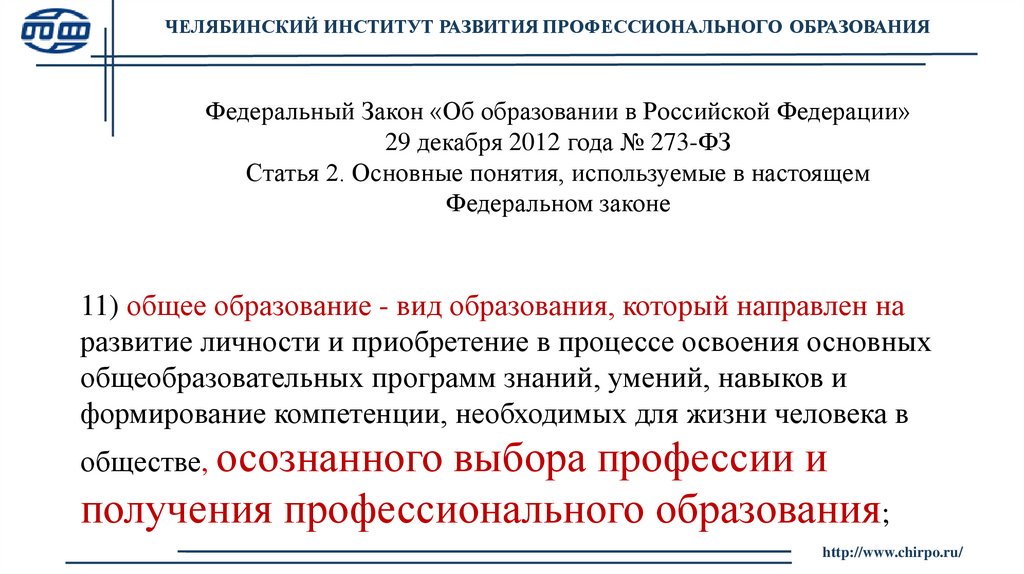 ЧЕЛЯБИНСКИЙ ИНСТИТУТ РАЗВИТИЯ ПРОФЕССИОНАЛЬНОГО ОБРАЗОВАНИЯФедеральный Закон «Об образовании в Российской Федерации»