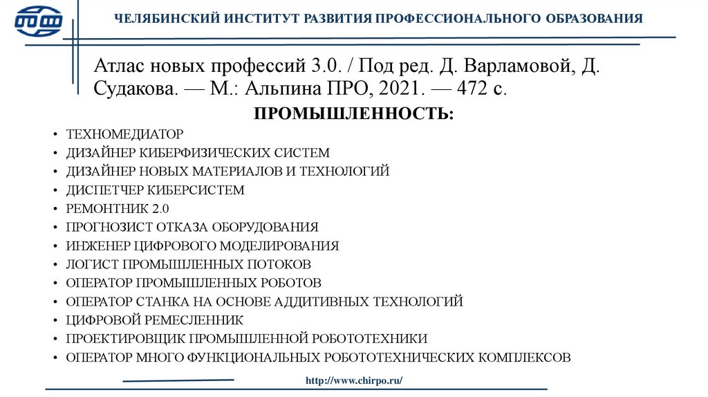 ЧЕЛЯБИНСКИЙ ИНСТИТУТ РАЗВИТИЯ ПРОФЕССИОНАЛЬНОГО ОБРАЗОВАНИЯАтлас новых профессий 3.0. / Под ред. Д. Варламовой, Д.