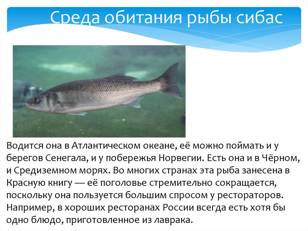 Среда обитания рыбы сибасВодится она в Атлантическом океане, её можно поймать и у
