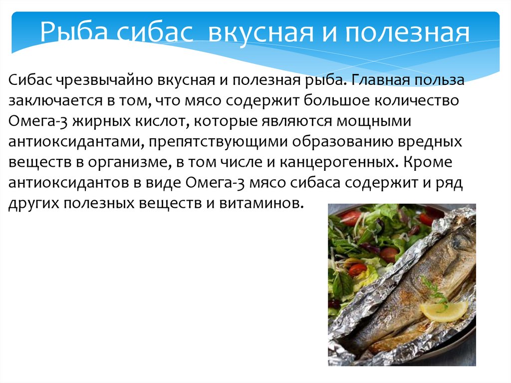 Рыба сибас вкусная и полезнаяСибас чрезвычайно вкусная и полезная рыба. Главная польза