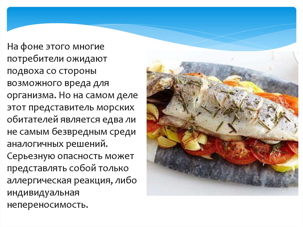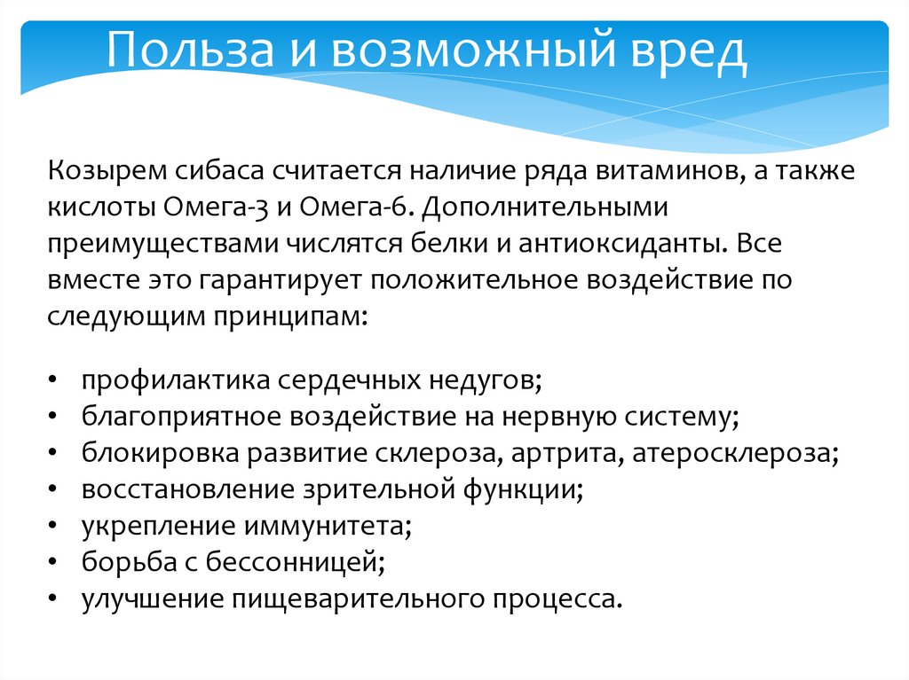 Польза и возможный вредКозырем сибаса считается наличие ряда витаминов, а также