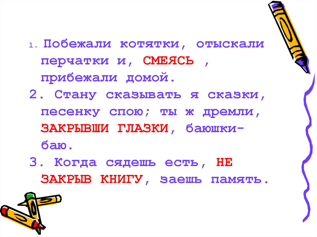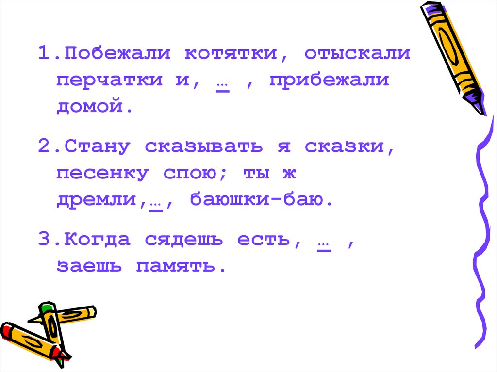 1.Побежали котятки, отыскалиперчатки и, … , прибежали