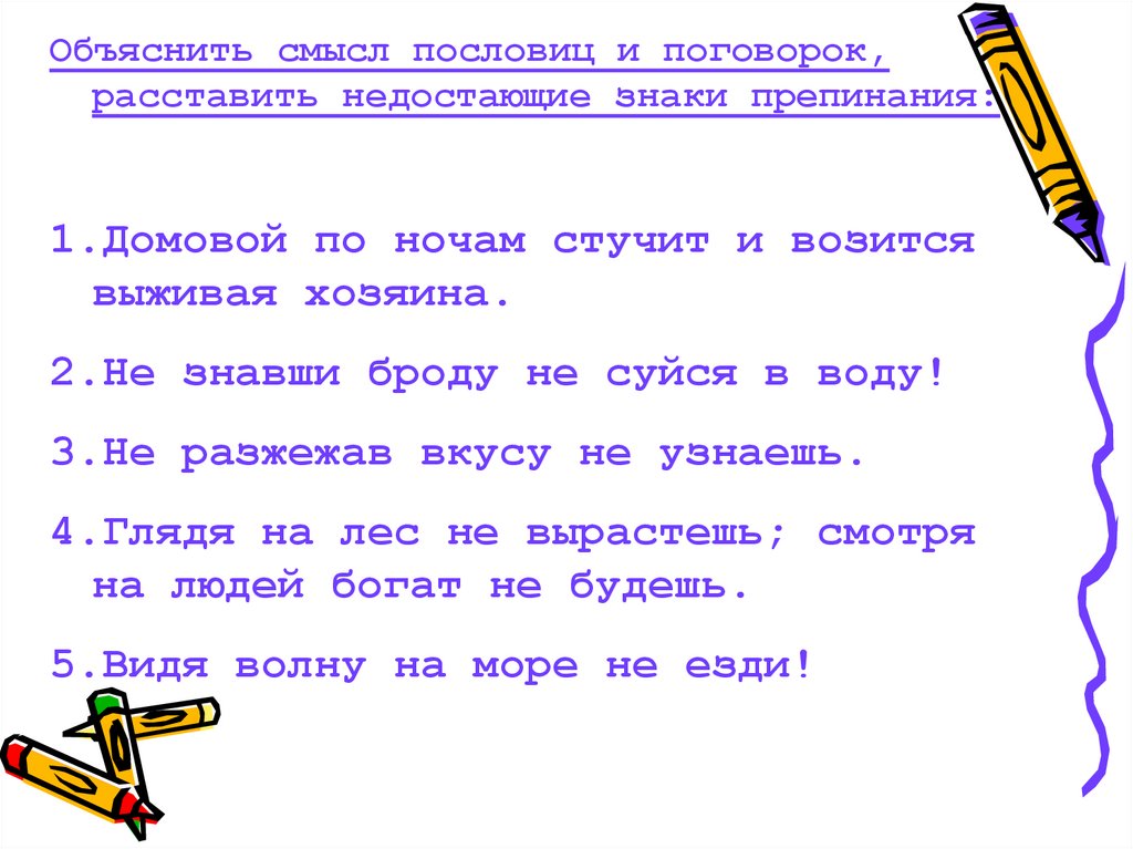 Объяснить смысл пословиц и поговорок,расставить недостающие знаки препинания: