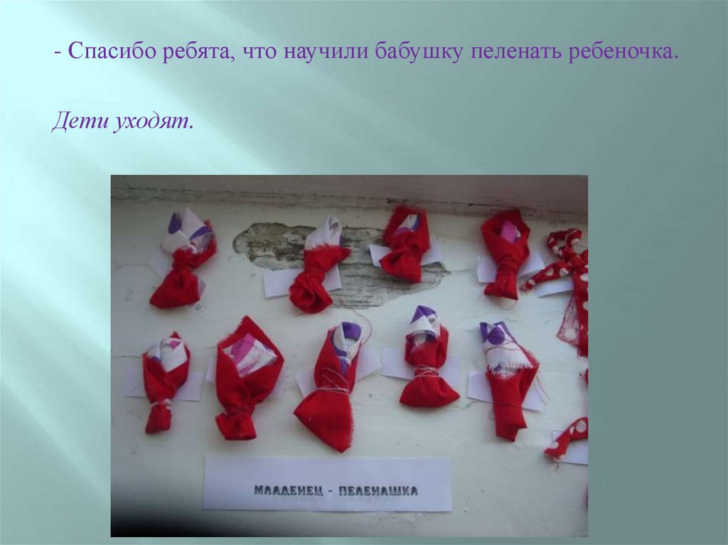 - Спасибо ребята, что научили бабушку пеленать ребеночка.Дети уходят.
