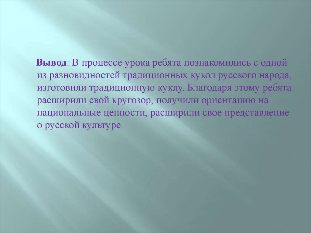 Вывод: В процессе урока ребята познакомились с однойиз разновидностей традиционных кукол русского народа,