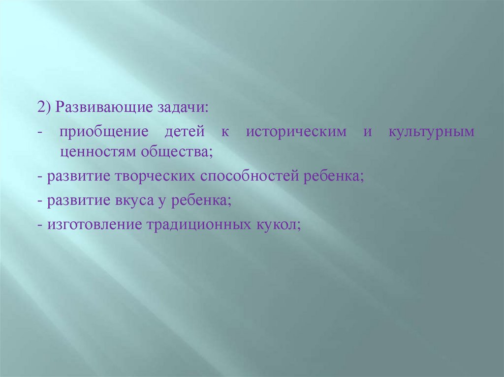 2) Развивающие задачи:- приобщение детей к историческим и культурным