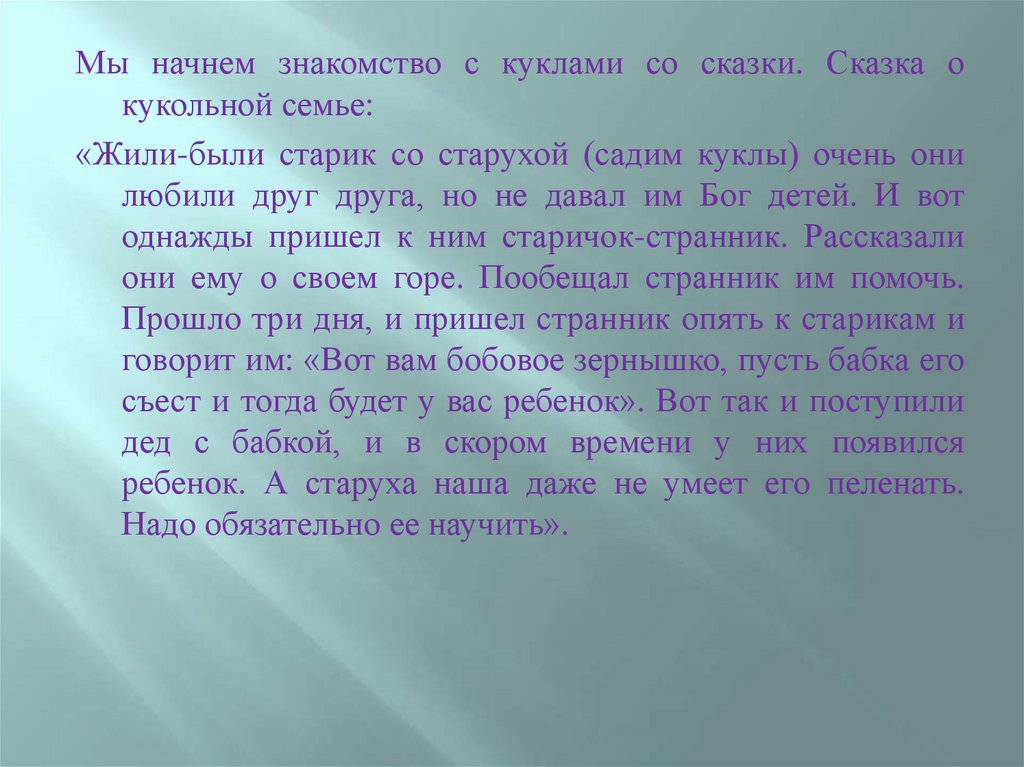 Мы начнем знакомство с куклами со сказки. Сказка окукольной семье:
