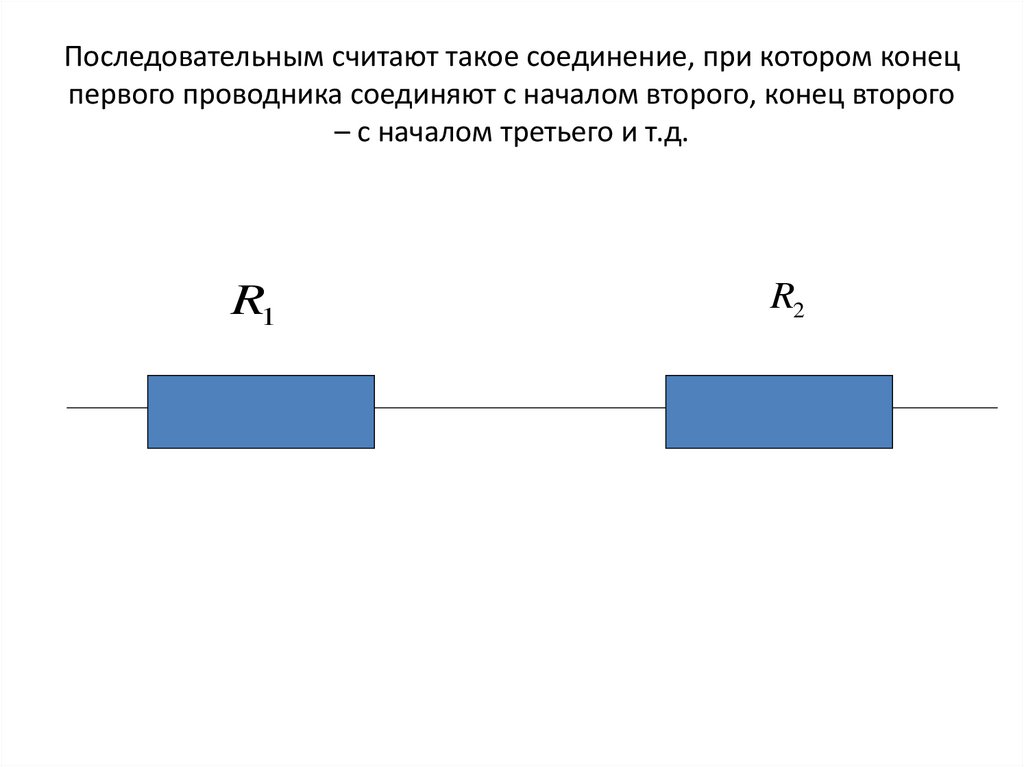 Последовательным считают такое соединение, при котором конецпервого проводника соединяют с началом второго, конец второго