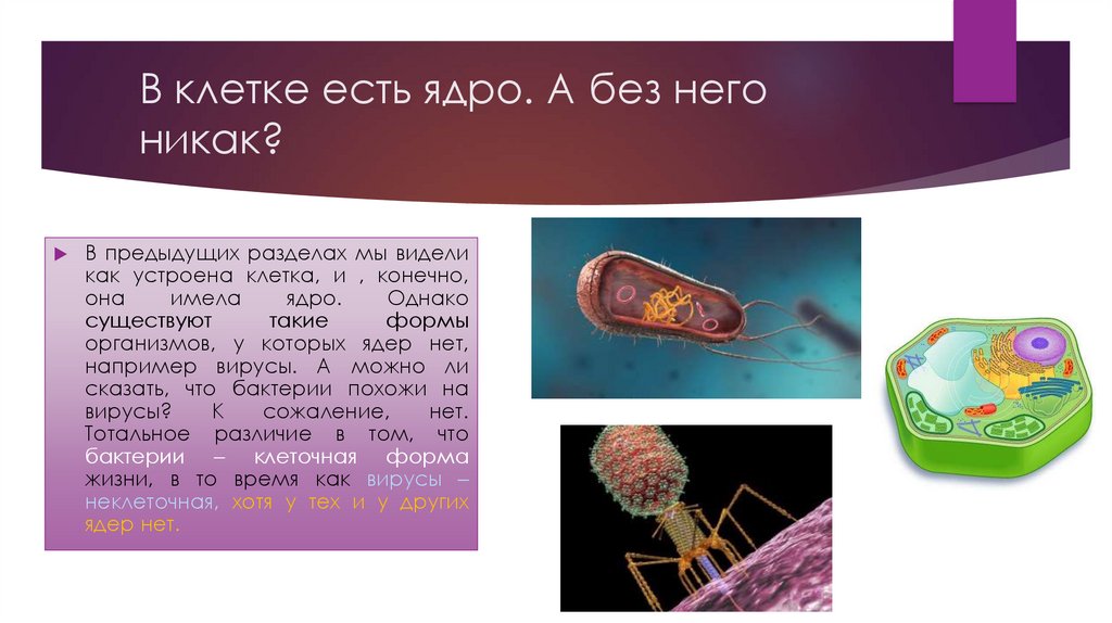 отсутствием ядра, а где вирус с его неклеточным строением и отсутствием ядра», - это введет нас в