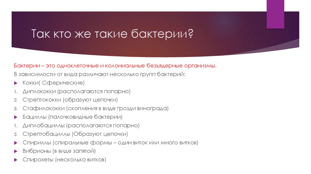 Так кто же такие бактерии?Бактерии – это одноклеточные и колониальные безъядерные организмы.