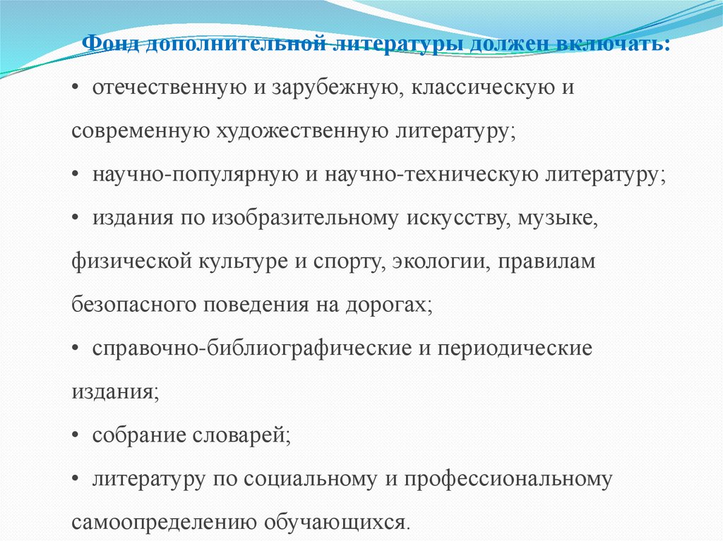 Фонд дополнительной литературы должен включать:• отечественную и зарубежную, классическую и