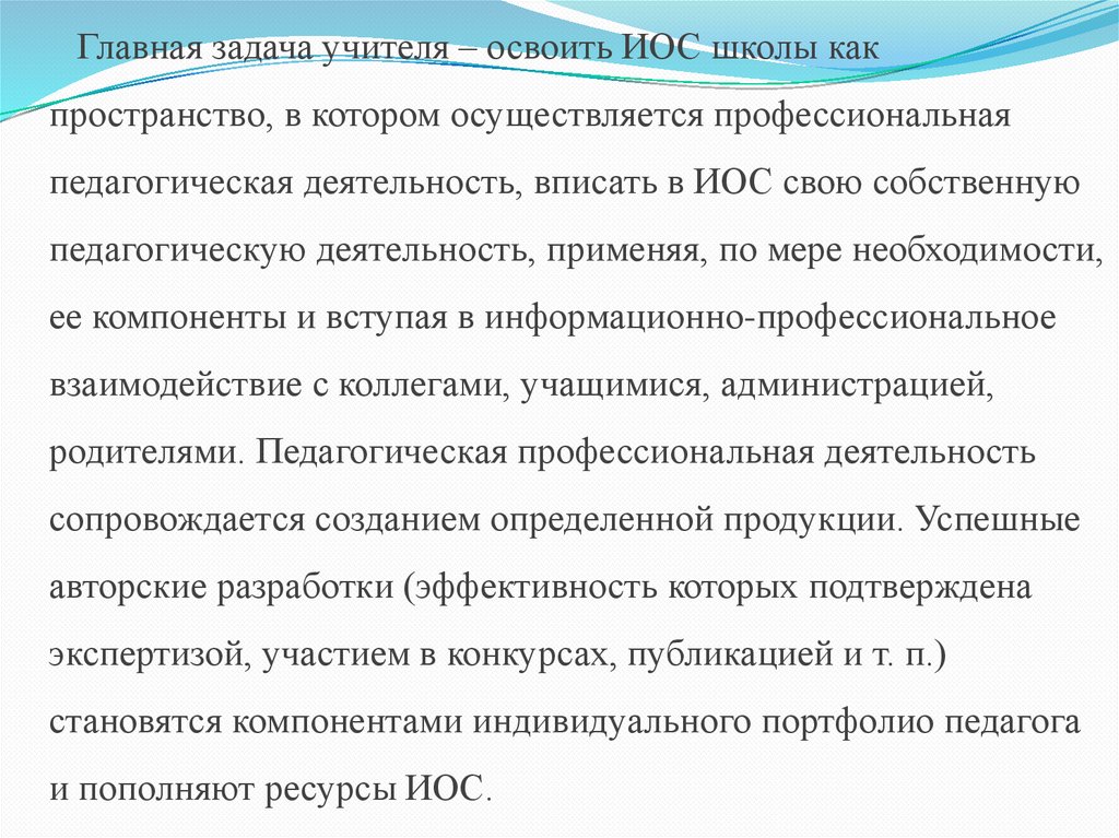 Главная задача учителя – освоить ИОС школы какпространство, в котором осуществляется профессиональная