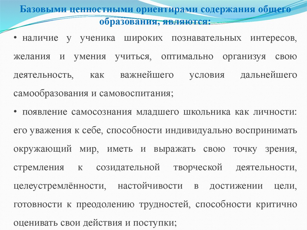 Базовыми ценностными ориентирами содержания общегообразования, являются: