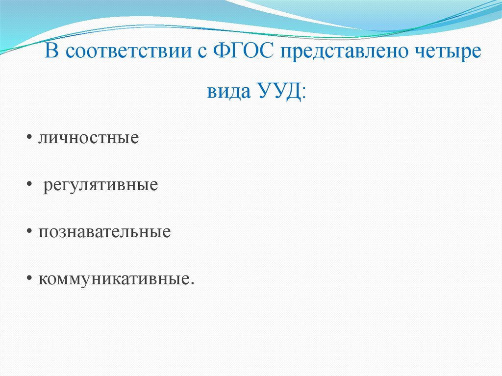 В соответствии с ФГОС представлено четыревида УУД: