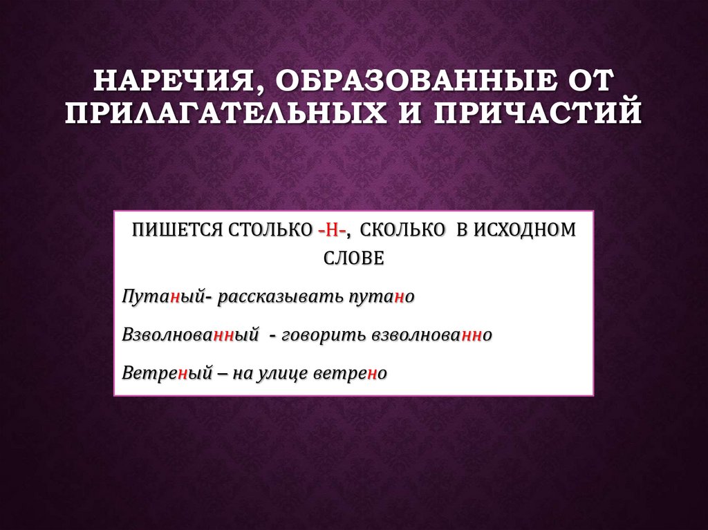 НАРЕЧИЯ, ОБРАЗОВАННЫЕ ОТПРИЛАГАТЕЛЬНЫХ И ПРИЧАСТИЙ