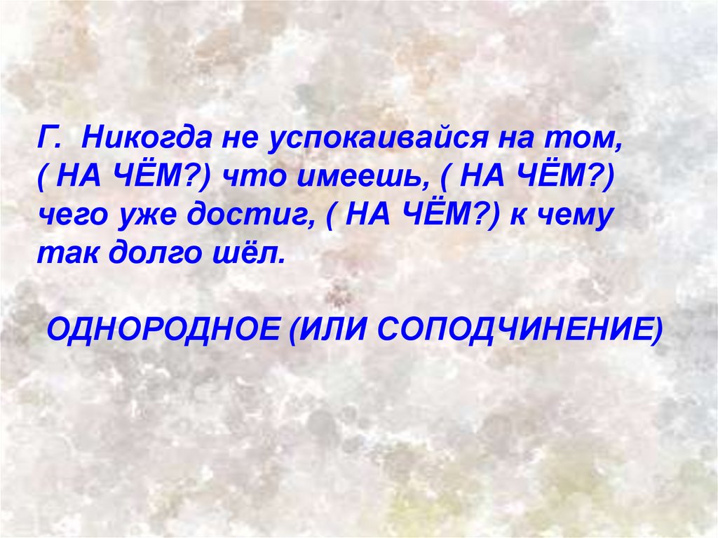 Г. Никогда не успокаивайся на том,( НА ЧЁМ?) что имеешь, ( НА ЧЁМ?)