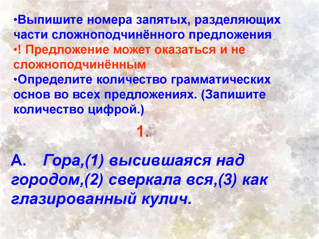 •Выпишите номера запятых, разделяющихчасти сложноподчинённого предложения.