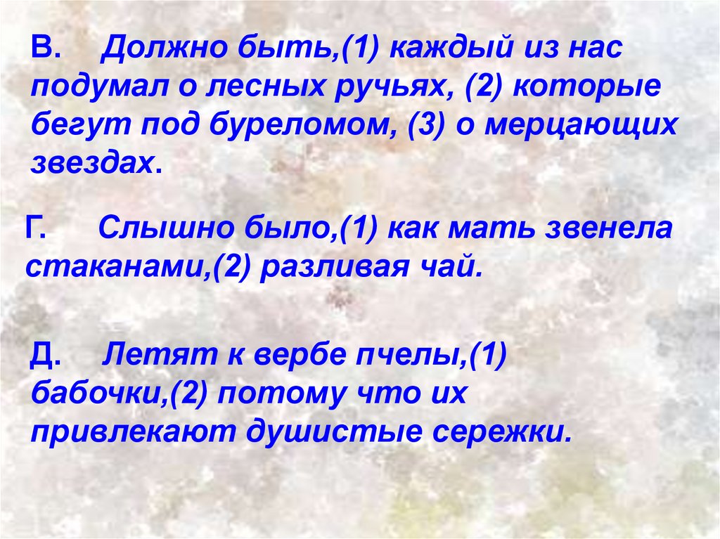 В. Должно быть,(1) каждый из насподумал о лесных ручьях, (2) которые
