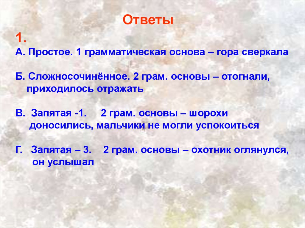Г. Запятая – 3. 2 грам. основы – охотник оглянулся,