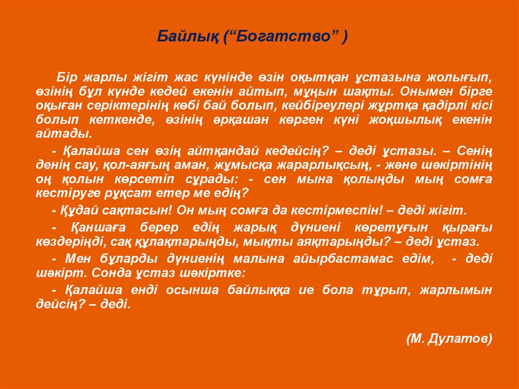 Байлық (“Богатство” )Бір жарлы жігіт жас күнінде өзін оқытқан ұстазына жолығып,