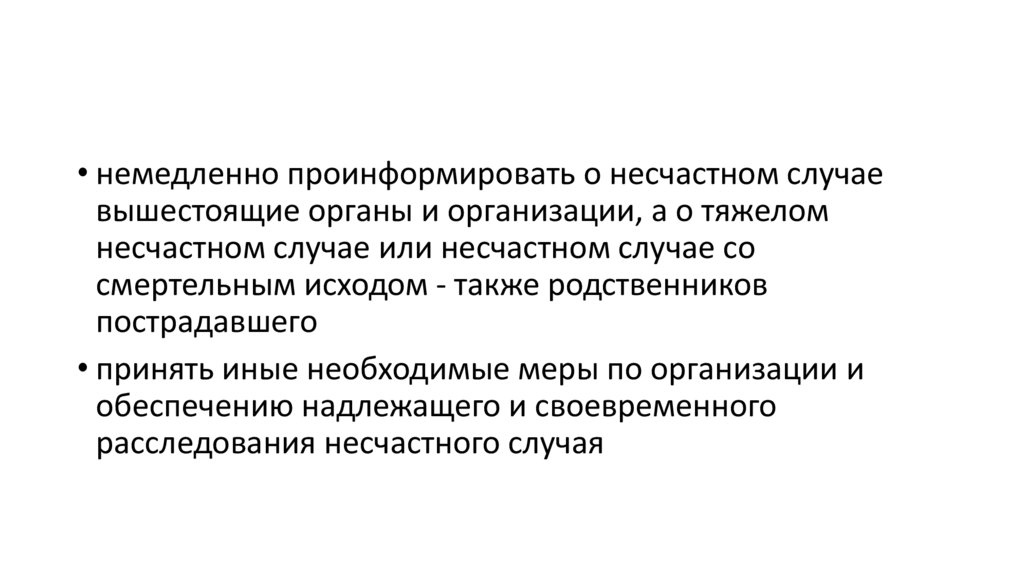 • немедленно проинформировать о несчастном случаевышестоящие органы и организации, а о тяжелом